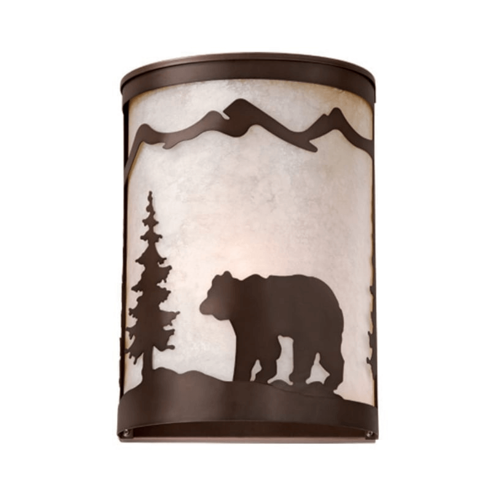 Complete the indoor or outdoor theme of your rustic cabin with the Tranquil Bear Wall Sconce. This sconce sits flush against the wall and features a majestic scene with a bear, tree and mountain illuminated by the light within. The bronze finish adds to the elegance of this versatile fixture.
