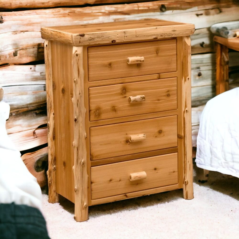 4 Drawer Cedar Chest is hand crafted and features sturdy mortise and tenon construction, with superb finishes. Each log is handpicked to create a unique, one of a kind piece of furniture that is full of character. Expect to see knots, beetle tracks, burls, and other distinctive characteristics that add to the rustic beauty of the furniture. Our manufacturer is located 1 hour away from cabinplace.com, which gives us an Exclusive relationship that ensures your furniture will live up to our high standards - and yours! The Manufacturer offers a Limited Lifetime Warranty on all furniture products.