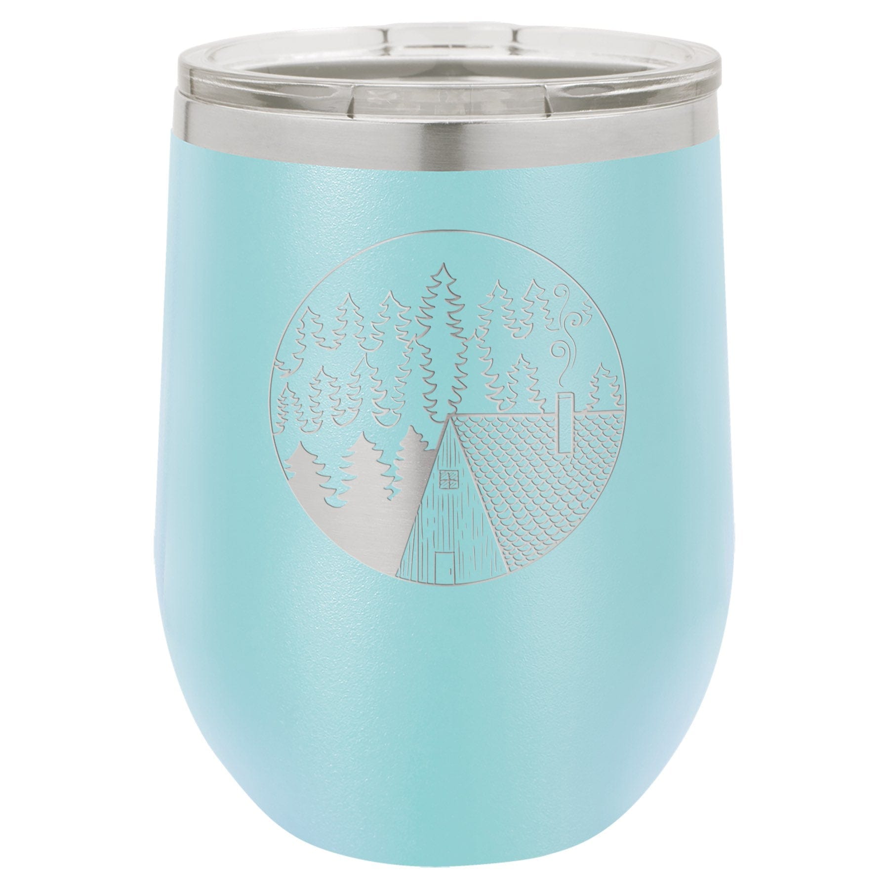 This powder coated 12 oz wine tumbler features a rustic cabin scene and has 2X the heat and cold resistance compared to a glass or plastic wine glass.