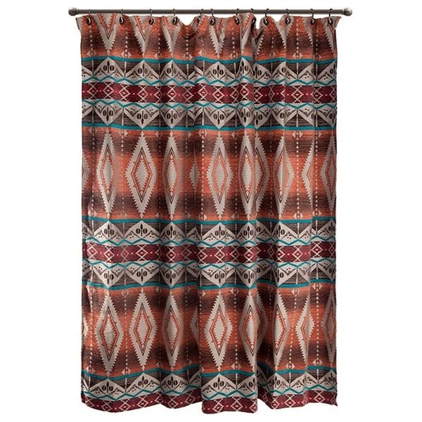 The Rayos Sunset Shower Curtain features a stunning geometric design with a bold color palette that will handsomely infuse your Southwestern decor with modern styling. Striking desert tones of Cajun red, blazing orange, turquoise, chocolate brown, and sandstone naturally accentuate the chic diamond and chevron patterning to transform your rustic bathroom motif. Infuse your rustic decor with Southwestern flair and classic design elements.