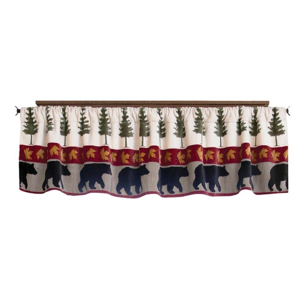 The Pine Mountain Valance adds brightness to your living room or den while tying together your rustic cabin decor. The valance features three horizontal segments, which depict bears, leaves and pine trees. The earth tones in the valance highlight the various design elements to let each shine.