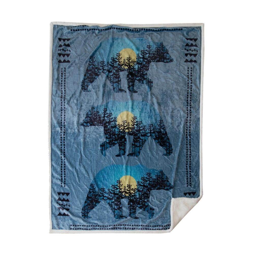 The Bearscape Sherpa Throw Blanket weaves together the natural beauty of the forest with cool and calming tones to help you relax at night. The design of the blanket features outlines of bears filled with the moon shining brightly over towering trees. White Sherpa lining borders the design.