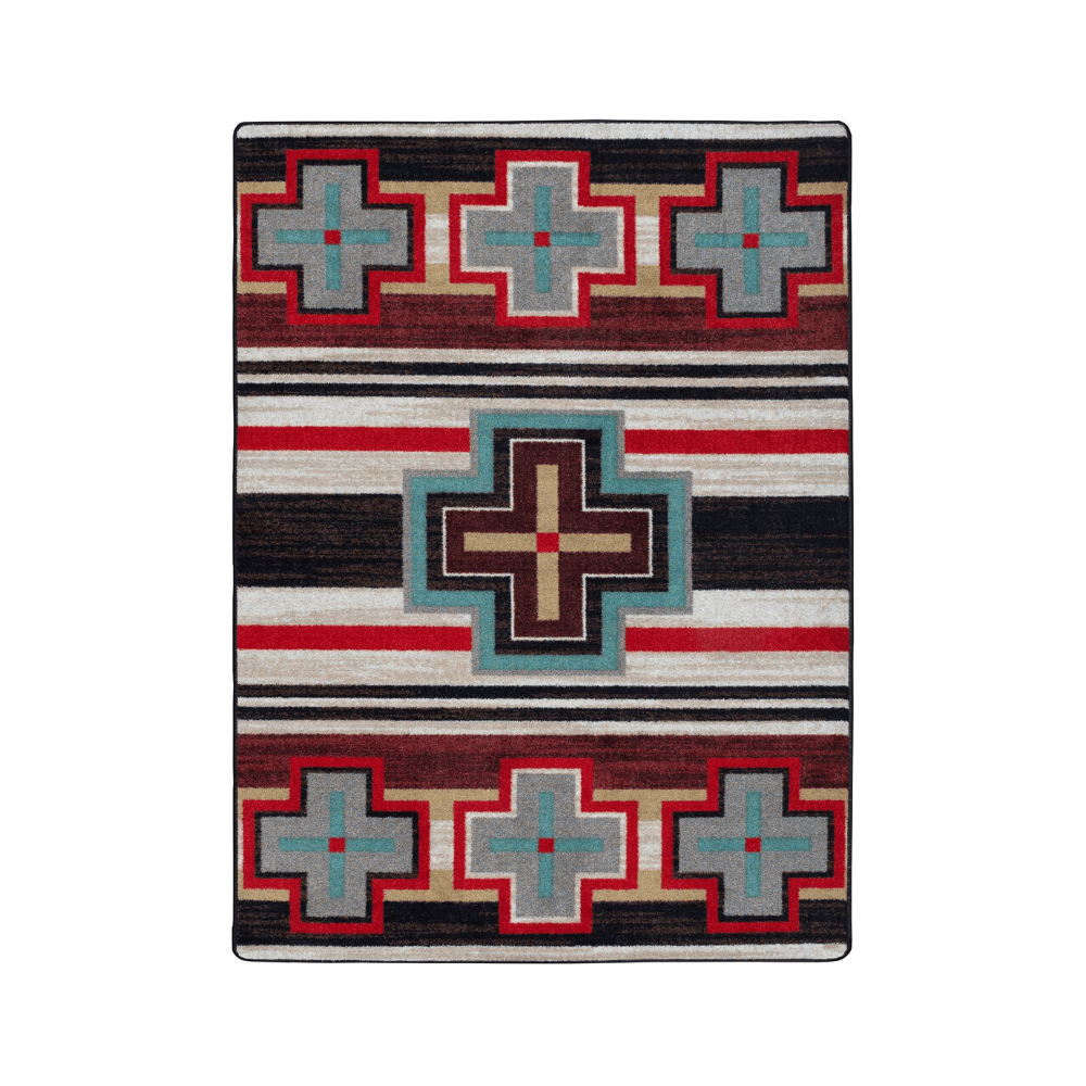 Feel the warmth emanating from the Heat Cross Rug every time you sit down in your living room. The rug features a bold pattern that includes black, red and brown stripes, as well as cross elements in turquoise, red, gray and black. These combinations bring the heat into your rustic home decor.