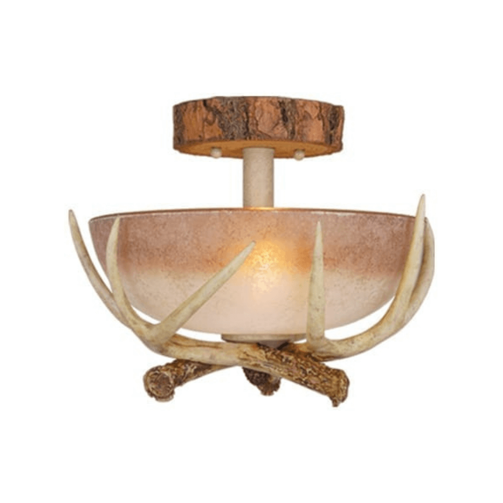 The Tavern 12" Antler Semi Flush Ceiling Light transforms your space into the rustic lodge of your dreams. This ceiling light features cream glass that glows softly to produce just the right amount of light. Faux antlers grace the bottom of the light to create a stunning visual in your home.