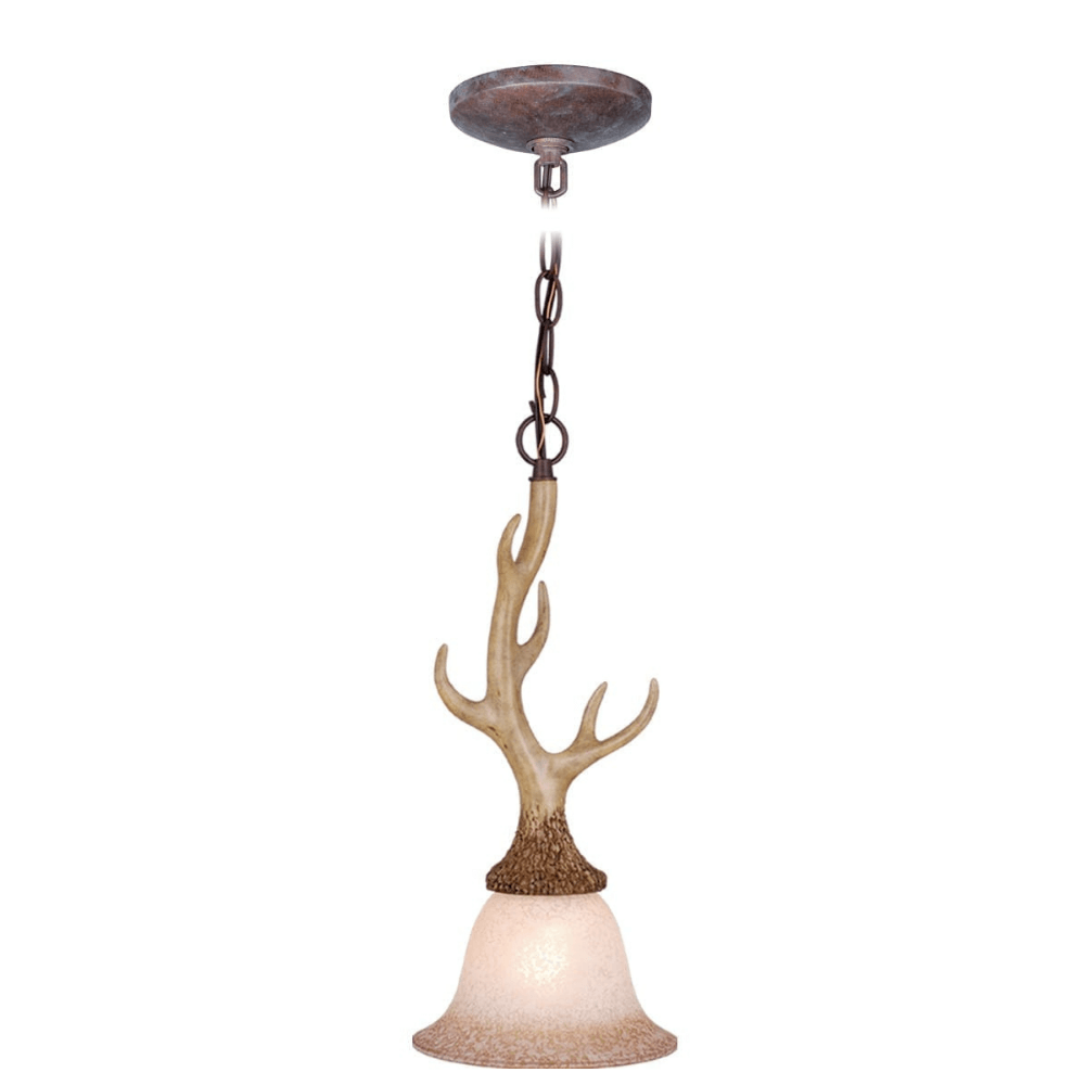 The Tavern 7" Mini Pendant Ceiling Light offers a simple yet stylish lighting solution for your home. The fixture features a faux antler suspended between the chain and light itself, as well as elements of pine bark and wood for added texture. The cream glass creates a soft glow in your room.
