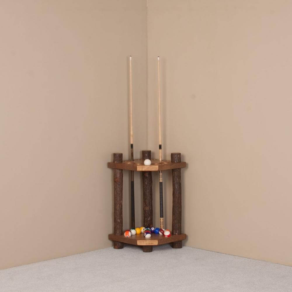 Enhance the rustic decor of your den or game room with the Treetop Lodge Corner Cue Rack. This cue rack easily tucks into any corner of the room, which allows you to easily access your cue sticks and billiards balls without infringing on the rest of your space. Features a honey pine finish.