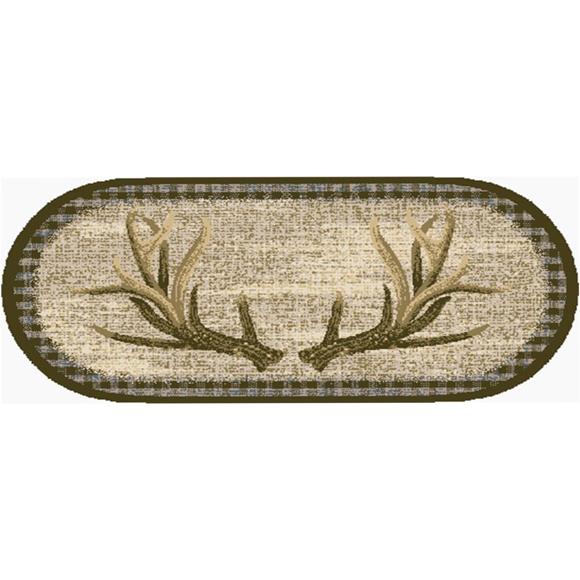 Here's another trophy for your game room. This Twisted Rack oval rug has prominent antlers against a simple beige background. A brown checkered border frames the rug.