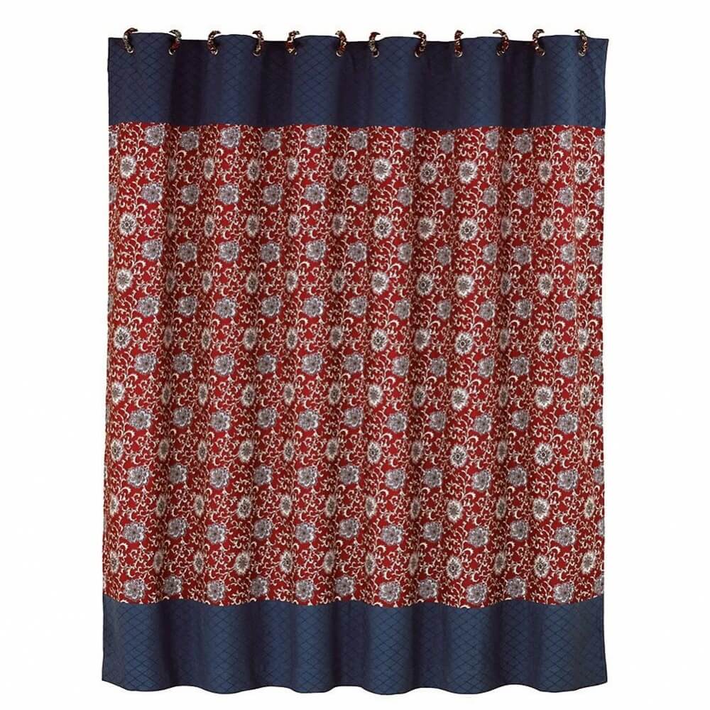 The Western Rose Shower Curtain will instantly transform your rugged bathroom motif into a stylish showcase of sophisticated ranch styling. A gorgeous blue floral Bandera pattern elegantly adorns the red shower curtain with delicate detailing while an eye-catching blue border lines the top and bottom trim for an extra hint of style. Measuring 72"H x 72"W, our striking western accent will upgrade your ranch decor with a soft, western look.