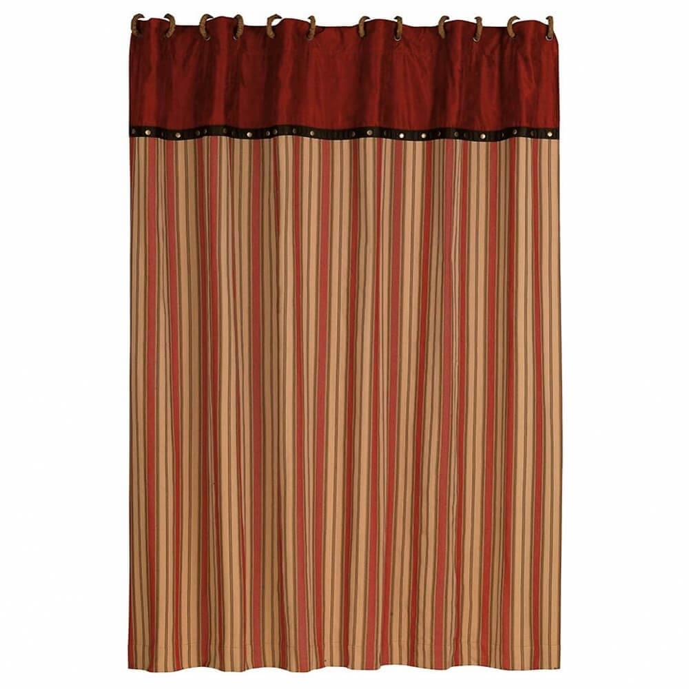 The Rock Canyon Shower Curtain features a tan and red serape striped body that is accented with a red, micro-suede header. The shower curtain is accented with chocolate brown, faux leather suede and metal studs. Matching shower curtain rings are included to complete the overall look and feel of this shower curtain. It measures 72"W x 72"H.