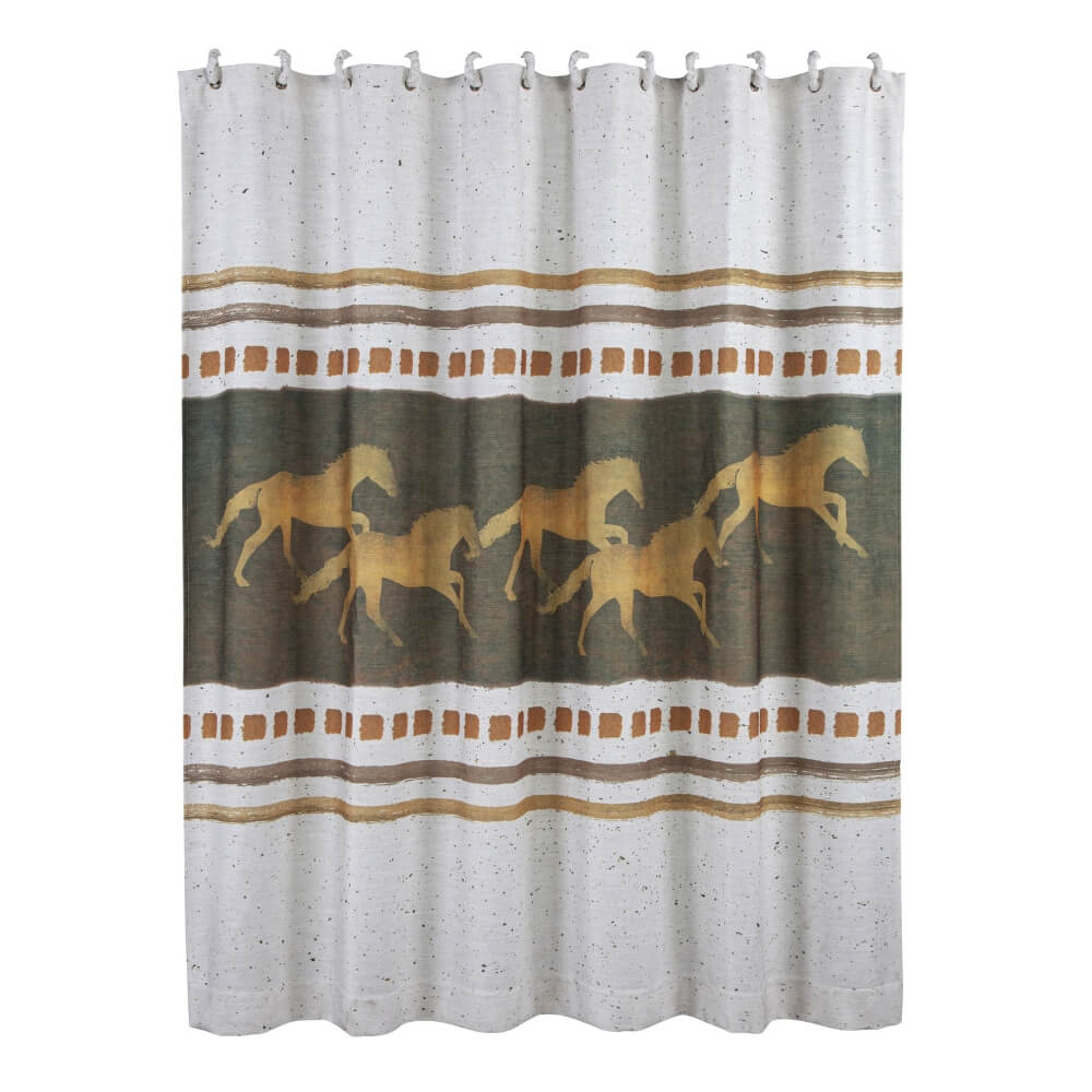 Feel the rush of wind and the warmth of the sun when you see the Morning Gallop Shower Curtain in your bathroom each day. You will be drawn to the rustic color palette and the horizontal lines that draw your attention to the horses running free across the center. It’s great for use year round.