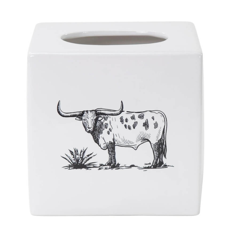 Ensure that your rustic home decor flows through every room when you bring home the Ranch Sketches Tissue Box Cover. Whether you use this in your living room or bathroom, you help hide drab tissue boxes and create new visual elements that your guests will love. Made of ceramic for durability.