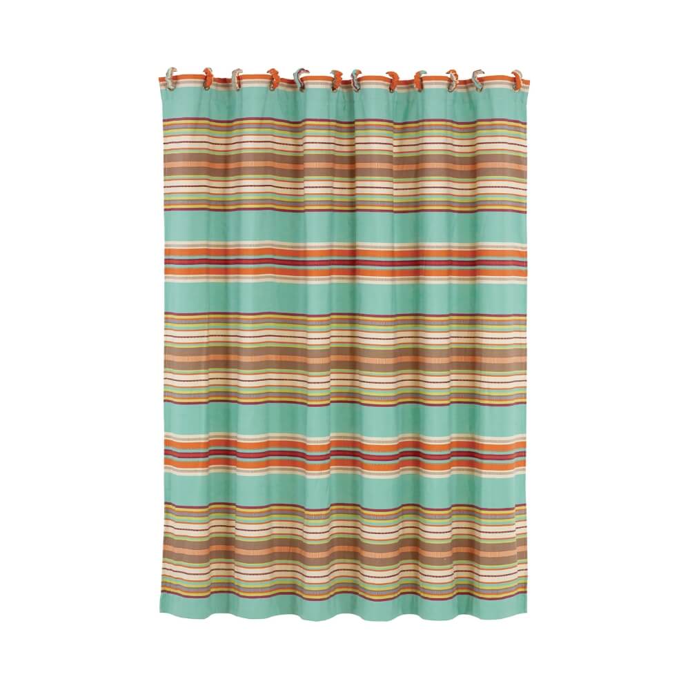 Brighten your bathroom and get energized for the day when you see the Sonora Stripes Shower Curtain in your home. This beautiful shower curtain features brilliant shades of turquoise, red and orange, which remind you of the natural elements that you can find exploring the Southwest landscape.